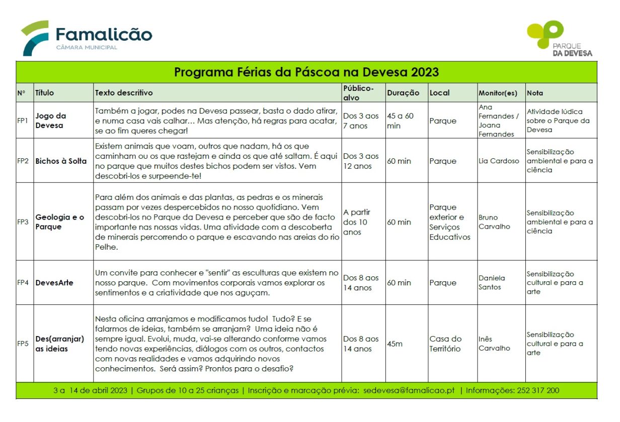 Apresentamos o programa "Férias da Páscoa na Devesa" para 2023, a decorrer entre 3 e 14 de abril. Estas atividades estão sujeitas a agendamento e inscrição prévia através do email sedevesa@famalicao.pt. Pode obter mais informações através do telefone 252317200 (Serviços Educativos do Parque da Devesa).