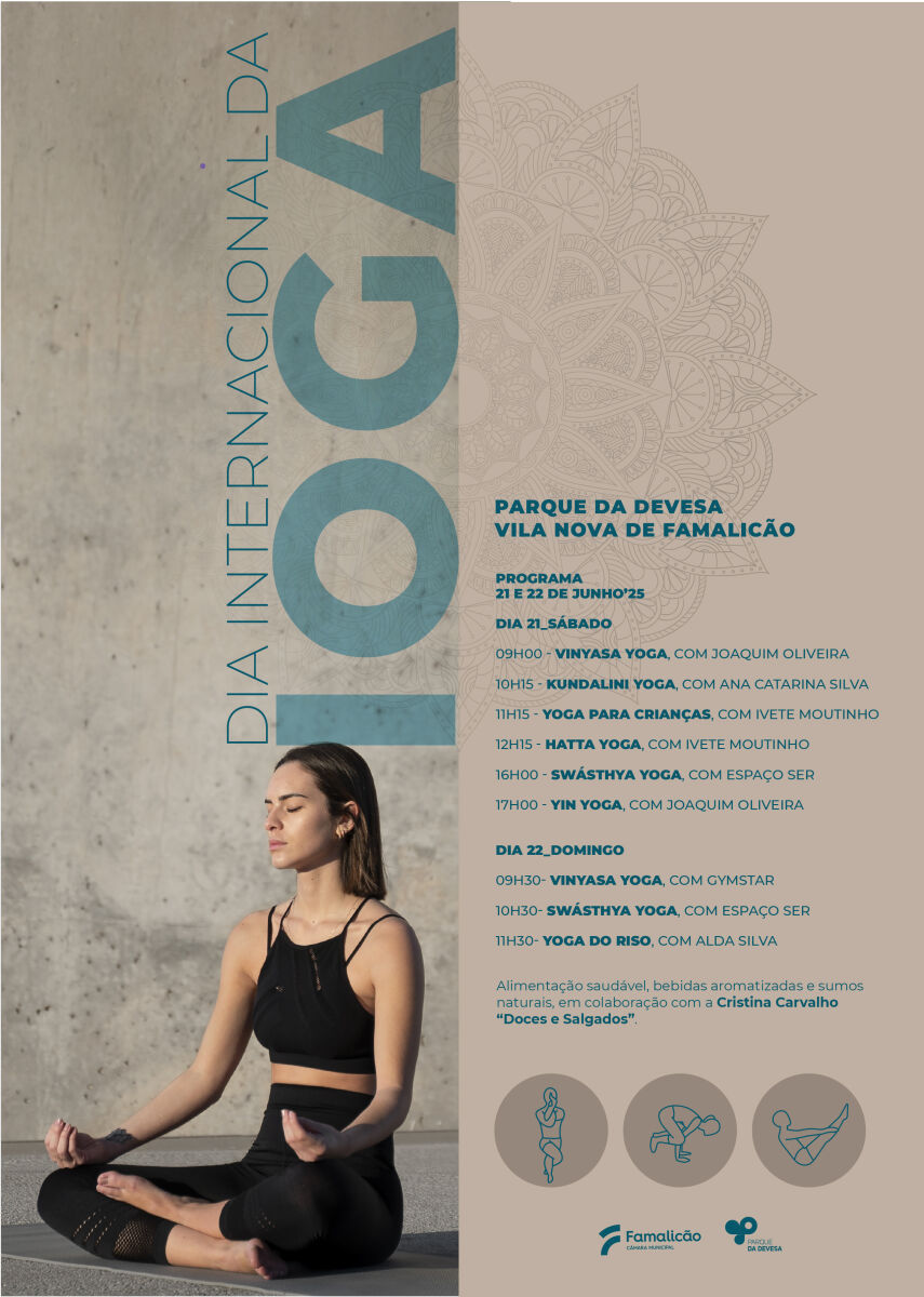 Dia 21/6, sábado: 9h00 - Vinyasa Yoga, com Joaquim Oliveira; 10h15 - Kundalini Yoga, com Ana Catarina Silva; 11h15- Yoga para crianças, com Ivete Moutinho; 12h15- Hatta Yoga, com Ivete Moutinho; 16h- Swásthya Yoga, com Espaço Ser; 17h- Yin Yoga, com Joaquim Oliveira.